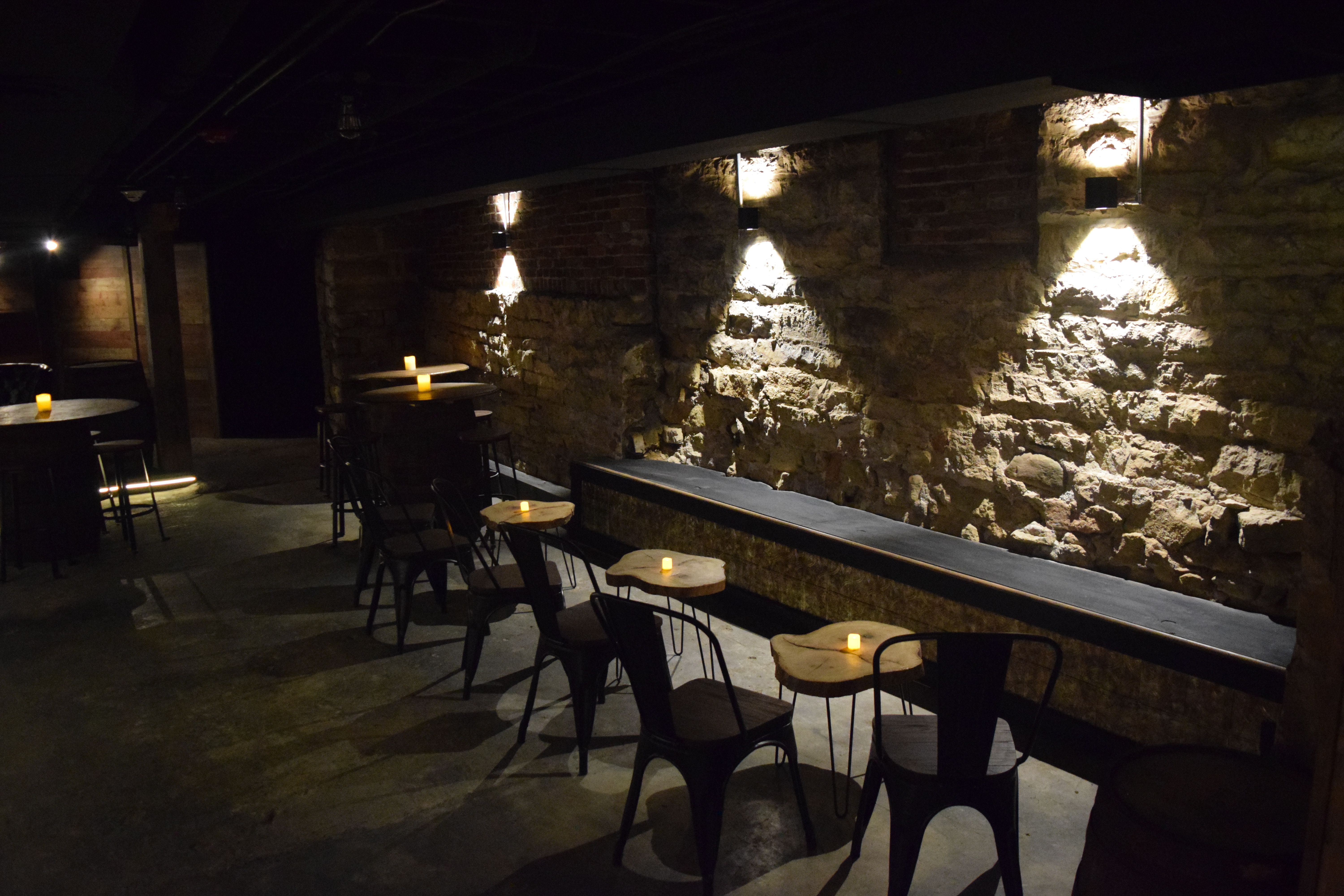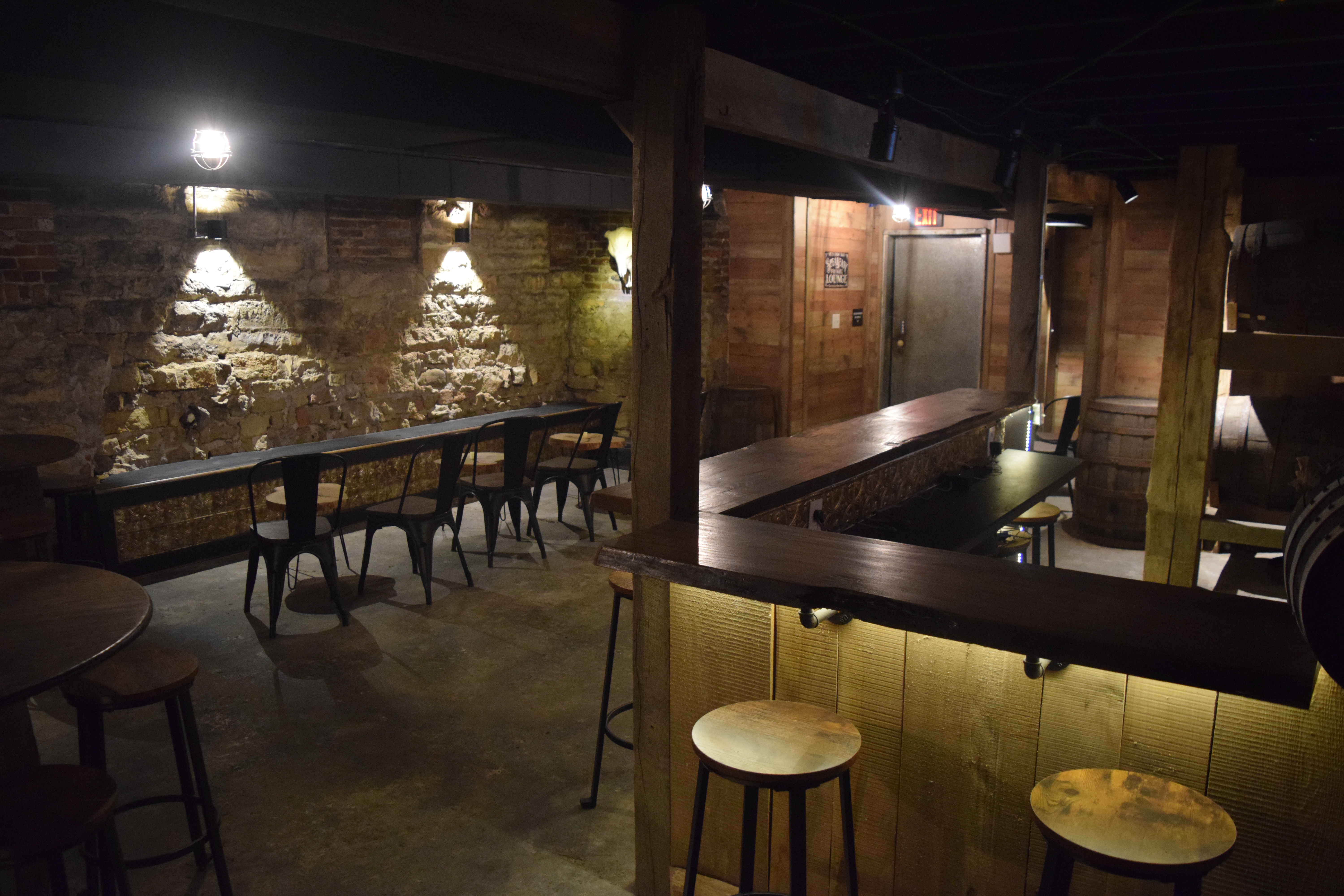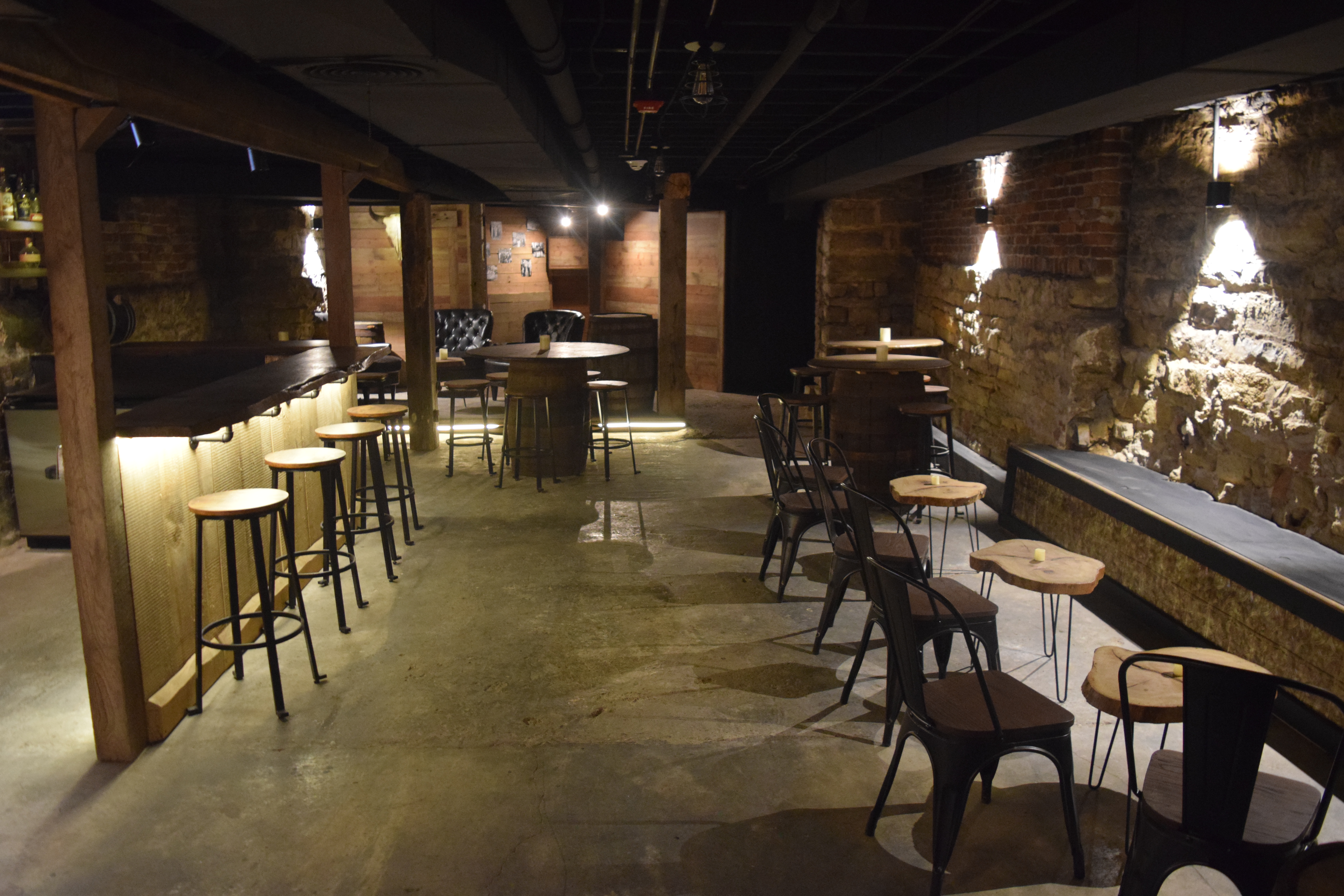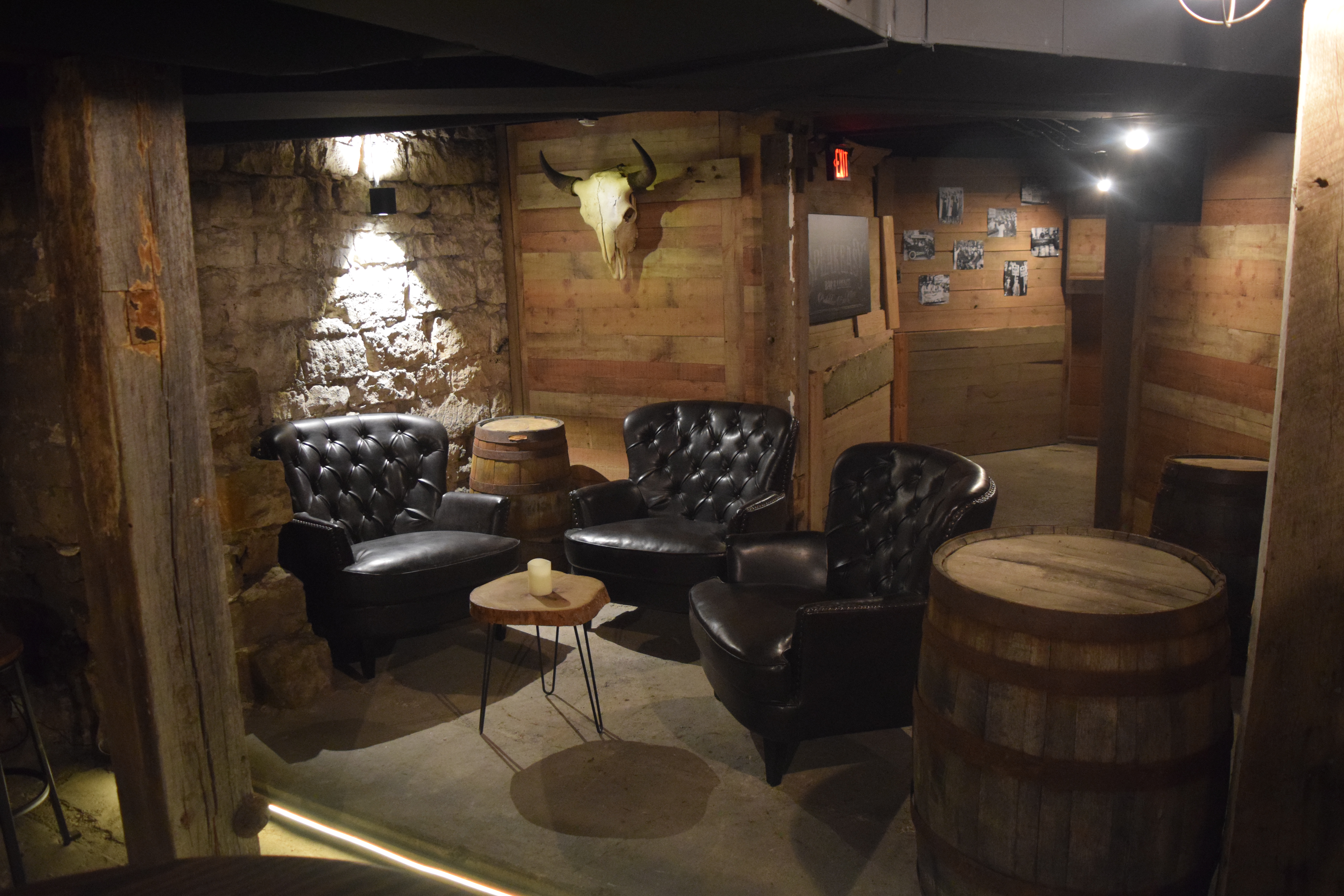 Stepping into the Speakeasy, guests are instantly transported to an era of rustic and nostalgic charm. The walls, adorned with exposed brick and stone, create an inviting and warm atmosphere reminiscent of a bygone age. Whiskey barrel tables and decor add a touch of authenticity and character, making this space uniquely enchanting.